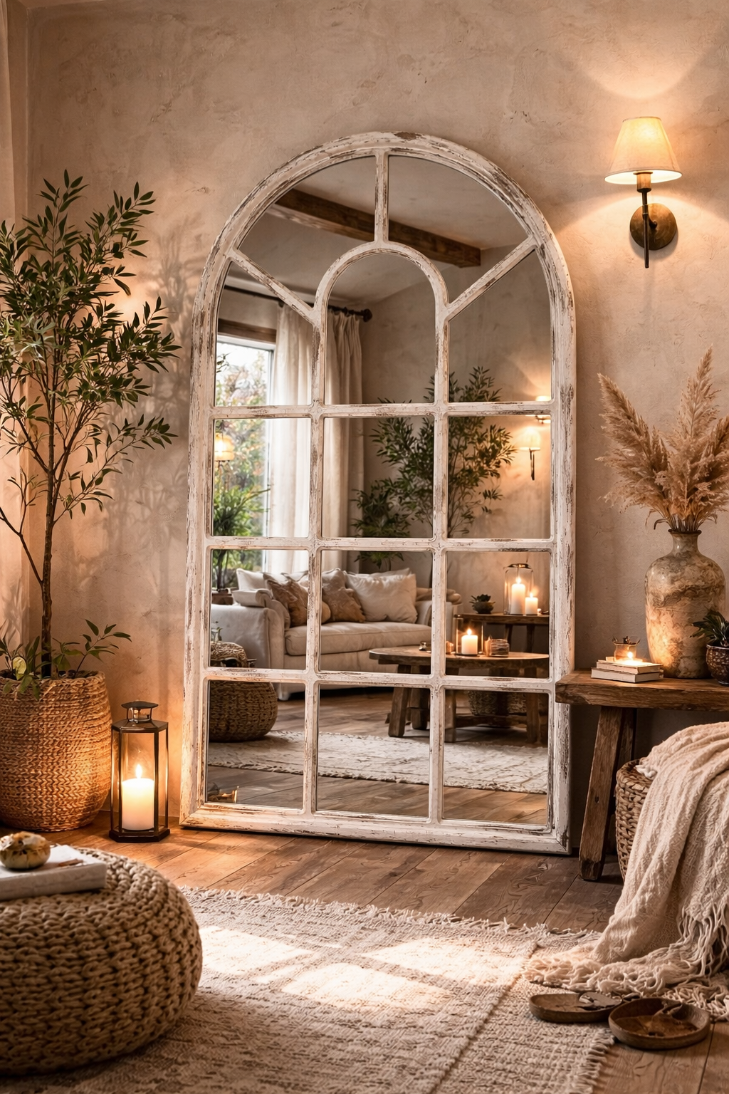 Espejo decorativo de gran formato con marco de madera envejecida que aporta calidez y carácter a cualquier espacio. Su diseño de arco superior crea una silueta elegante y moderna, perfecta para pasillos, dormitorios o salas de estar. Con medidas de 87 cm de ancho por 170 cm de alto, este espejo XL amplifica la luz natural y genera sensación de amplitud en ambientes. La madera envejecida ofrece un acabado rústico que combina con estilos nórdicos, bohemios e industriales. Ideal para quienes buscan un elemento decorativo que funcione como punto focal en la pared, mejorando la iluminación y la estética del hogar.